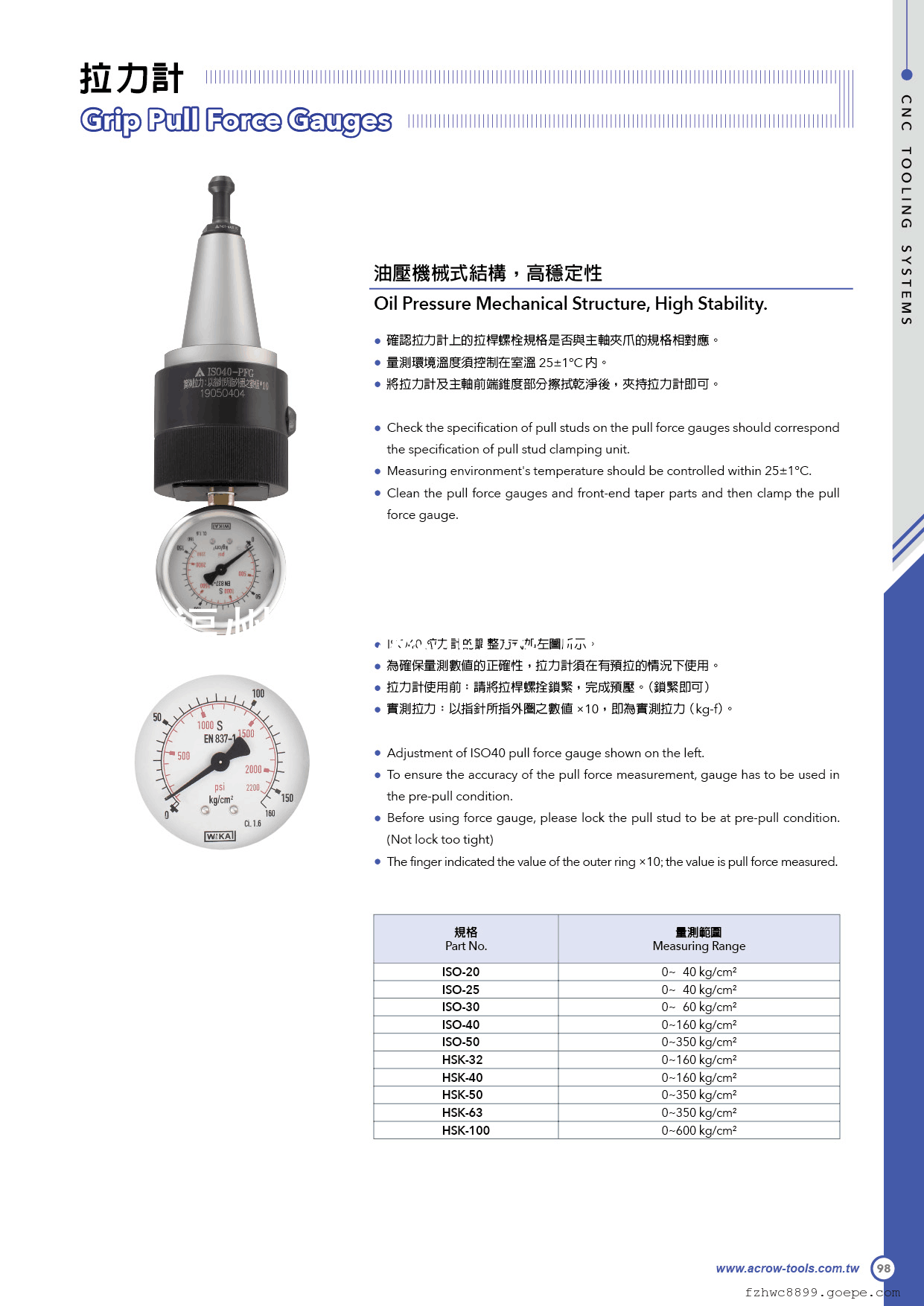 详细信息| 询价留言品牌:ACROW 型号:BT40 类型:指针式 测量范围:2500 N 测量精度:0.1 外形尺寸:80*300 mm 最大负荷值:1500-2200KG 推拉杆行程:850 重量:5 kg 适用范围:BT40 推拉杆行程:850 重量:5 kg -